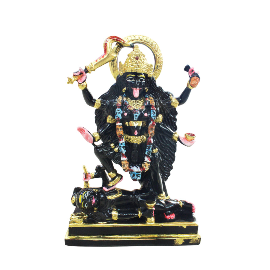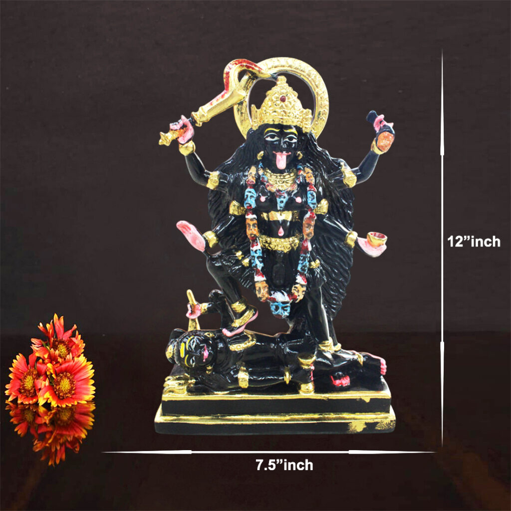 - Kali Mata, often depicted in her iconic form with a sword, a garland of skulls, and a commanding posture, is revered for her role in destroying evil forces and bringing about spiritual renewal. This statue serves as a symbol of empowerment, strength, and the destruction of negativity, making it an ideal piece for your pooja room, office, or living space.