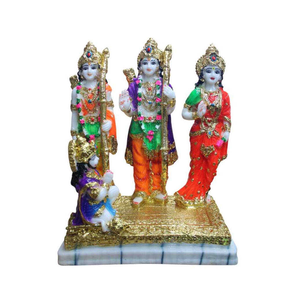 - A Marble Ram Darbar idol is a stunning depiction of Lord Ram, his wife Sita, and his loyal companion Hanuman, crafted from high-quality marble. This intricately carved idol typically showcases Lord Ram seated on a throne, flanked by his divine consort Sita and his devoted brother Lakshman. The sculpture is often enhanced with fine detailing, such as beautifully sculpted faces, ornate clothing, and delicately carved jewelry, symbolizing their royal lineage and divine grace.