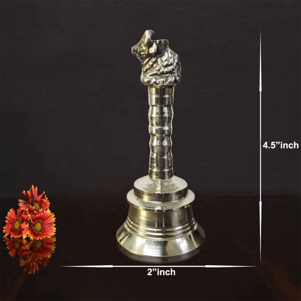 - Made from durable brass, the Nandi bell boasts a golden, lustrous finish that adds a regal touch to any temple, home, or spiritual space. The bell’s design typically features intricate carvings, with Nandi positioned prominently at the base or as part of the bell’s structure, often in a seated posture, exuding tranquility and devotion. The bell itself produces a clear, resonant sound, which is believed to invite divine blessings and create an atmosphere of peace and harmony during rituals and prayers.